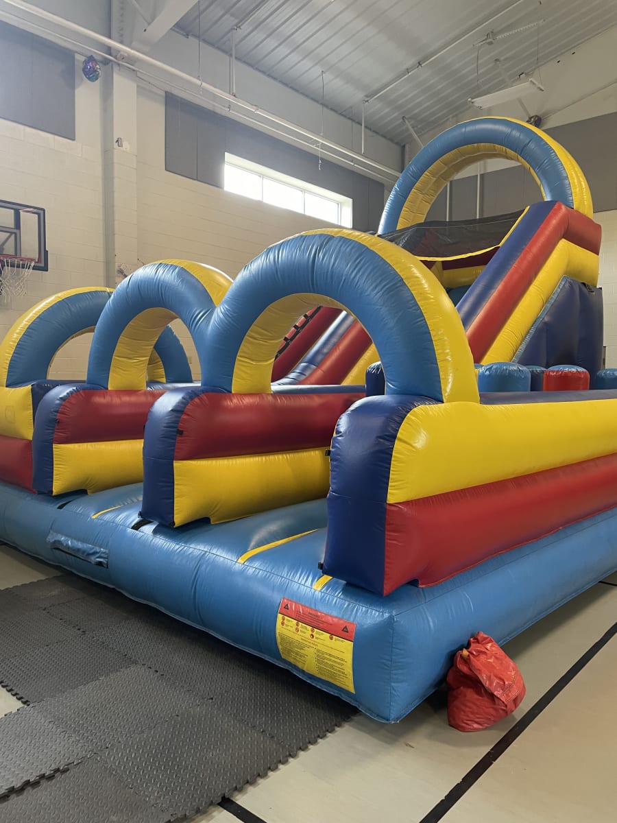 This obstacle course uses two 1.5 HP blowers, so a 4500-watt generator or higher is recommended when electrical outlets aren’t nearby. Our team provides delivery, setup, and takedown, including stakes and extension cords, to ensure everything runs smoothly and safely.
