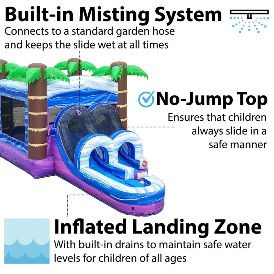 Measuring 15’ H x 13’ W x 26’ L, the Tropic Island Combo offers plenty of room for jumping and active play. Inside the bounce area, kids can enjoy a built-in basketball hoop for added interaction. The single-lane slide can be used wet or dry, giving you flexibility for hot summer days or cooler-weather events.