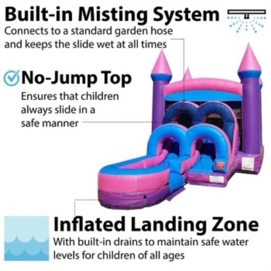 The Pink Playhouse Combo includes a single-lane slide that can be used wet or dry, giving you flexibility for warm summer days or cooler-weather events. Inside the bounce area, kids can jump freely and enjoy a built-in basketball hoop, adding extra interactive play and friendly competition.